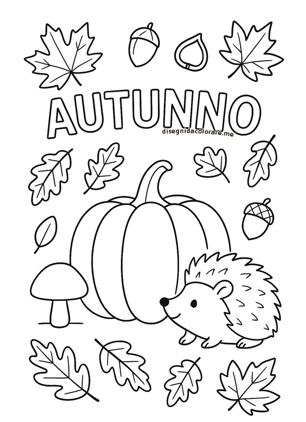 La pagina mostra la scritta AUTUNNO ben visibile in alto, accompagnata da disegni tipici come una grande zucca, un riccio sorridente, un funghetto e tante foglie sparse. Tutti gli elementi hanno linee pulite e spesse, perfette per essere colorate anche dai più piccoli.