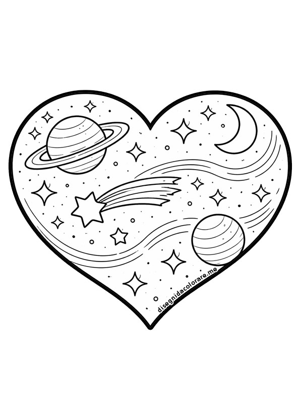 Il cuore con galassia da colorare è un disegno semplice e stilizzato che unisce la forma del cuore a stelle e pianeti ispirati allo spazio. Gli spazi ampi e le linee morbide lo rendono piacevole da colorare, adatto sia ai bambini sia agli adulti.