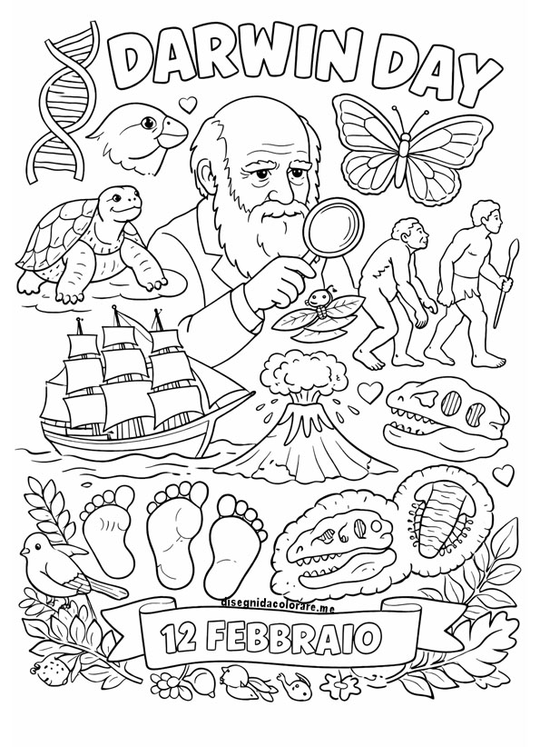 Una scena ricca di scoperte dedicata al Darwin Day, perfetta per parlare di scienza, natura ed evoluzione in modo semplice e coinvolgente. Tra animali, fossili, impronte e il celebre naturalista con la lente, l’illustrazione aiuta a raccontare come la vita sulla Terra sia cambiata nel tempo. Ideale per attività in classe legate alla curiosità, all’osservazione e alla storia delle specie.