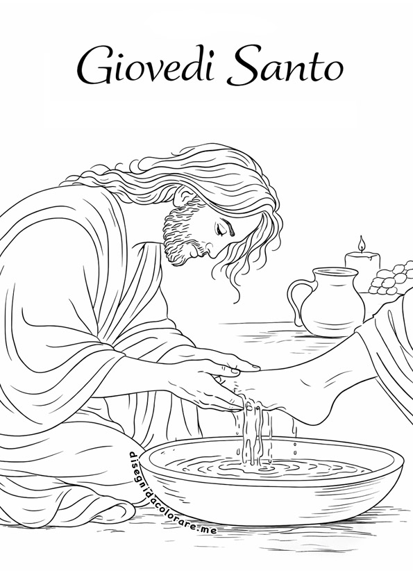 Disegno da colorare del Giovedì Santo con la scena della lavanda dei piedi di Gesù e dei discepoli