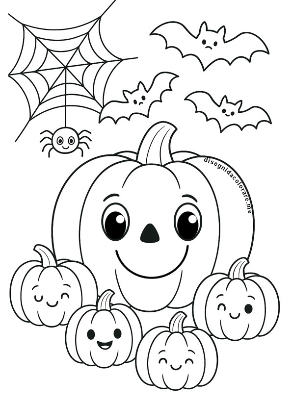 Disegno da colorare con una grande zucca sorridente circondata da piccole zucche felici, pipistrelli e un simpatico ragno. Perfetto per attività di Halloween a scuola o a casa.